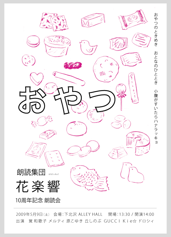 花楽響の16回目にして、1 0 周年記念朗読会。1 0 年前、はじめて公演を行った会場「下北沢アレイホール」で里帰り朗読会を行います。今回も現代モノ、詩、メンバーによるオリジナルと様々に趣向を凝らしてお送りします。ほのぼのワクワク。そんなイメージから「おやつ」というタイトルになりました。毎度毎度なにが飛び出すかわからない花楽響の朗読会、お楽しみに!